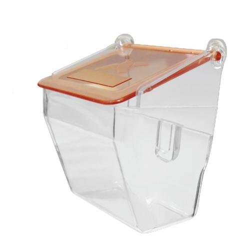 Permite rellenar el alimento sin retirarlo de la jaula, ya sea pasta o semillas, y cuenta con una muesca especial que evita que el ave pueda levantar la tapa.